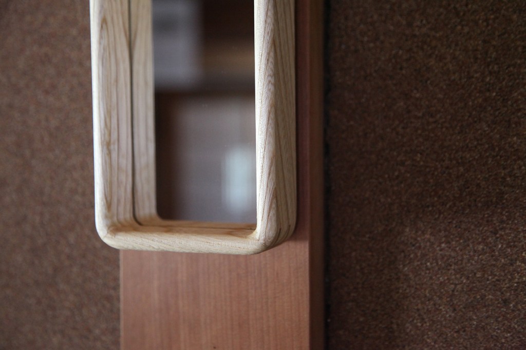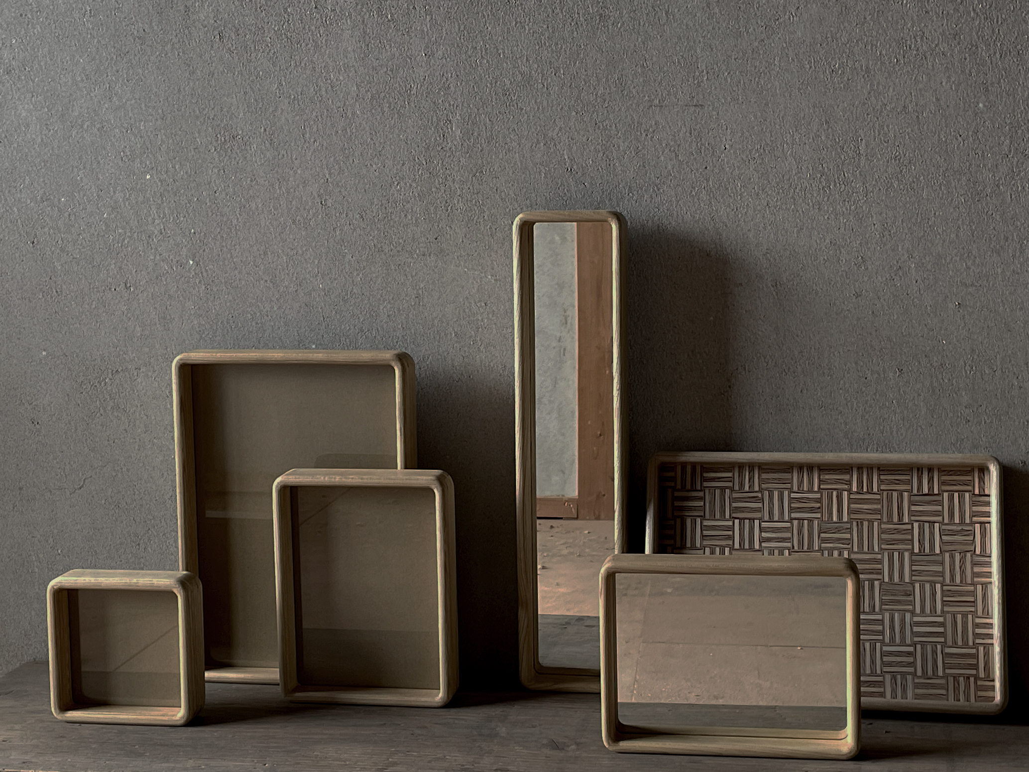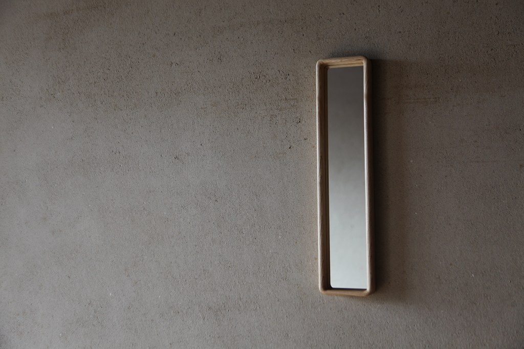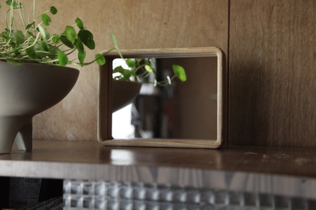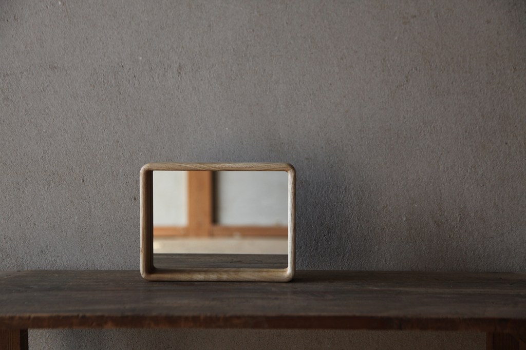 額と同じく、丸みのある木枠で囲まれた鏡は、手元に置きやすいコンパクトなサイズ感。
